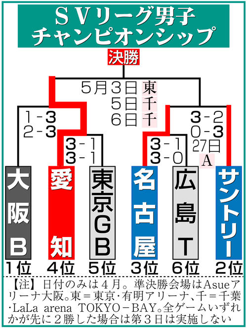 バレーボールの大同生命SVリーグ男子・チャンピオンシップ(CS)準決勝第3戦が行われる。2位のサントリーは名古屋と対戦する